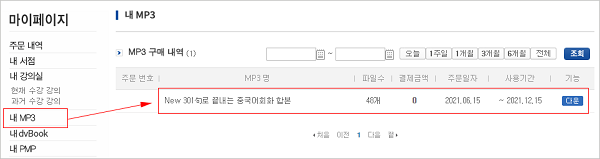 다락원 홈페이지 로그인→ 마이페이지→ 내 MP3→ 다운로드 버튼 클릭→ 다운로드 진행해 주세요. 다운로드한 압축(ZIP) 파일은 압축 해제 후 이용할 수 있습니다.