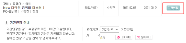 <기간 연장> ① 기간 연장은 1회만 신청 가능합니다. ② 기간 연장한 강의는 일시정지 신청이 되지 않습니다. ③ 기간 연장 금액은 1일 2천원입니다.