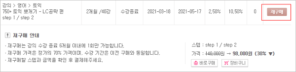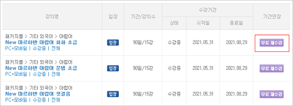 ex) 본 강의기간 30일 → 무료 재수강 30일 본 강의기간 60일 → 무료 재수강 60일