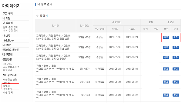 수강증명서, 출석증명서 발급이 가능합니다. 마이페이지에서 저장 및 인쇄할 수 있습니다. 로그인 후 마이페이지→ 개인 정보관리→ 증명서 페이지 확인