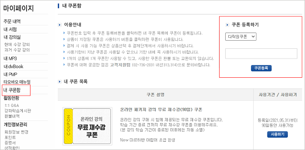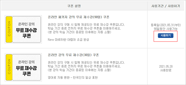 또는 마이페이지→ 내쿠폰함→ 무료 재수강 쿠폰 사용하기 클릭