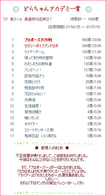 °³ÀÎ »çÀÌÆ®À̱ä ÇÏÁö¸¸ ³×ƼÁðµéÀÌ Âü¿©ÇÒ ¼ö ÀÖ´Â ¾ÓÄÉÀÌÆ® Äڳʵµ Ãæ½ÇÈ÷ °®Ãß°í ÀÖ½À´Ï´Ù. ´Ù¸¸ ÁÖÀÎÀåÀÌ ³»´Â °£´ÜÇÑ ÄûÁîÀÇ ´äÀ» ¸ÂÃß¾î¾ß ¾ÓÄÉÀÌÆ®¿¡ Á÷Á¢ Âü¿©ÇÒ ÀÚ°ÝÀÌ ÁÖ¾îÁý´Ï´Ù. ^.^ °ú°ÅÀÇ ¾ÓÄÉÀÌÆ® ¸ñ·ÏÀ» º¸´Ï °¢ ºÐ±âº° µå¶ó¸¶ÀÇ ¸¸Á·µµ, ±â´ëµµ, ÃÖ¿ì¼ö ÀÛǰ»ó, ÃÖ¿ì¼ö ³²¿ìÁÖ¿¬»ó, ÃÖ¿ì¼ö ¿©¿ìÁÖ¿¬»ó, ÃÖ¿ì¼ö Á¶¿¬»ó, ÃÖ¿ì¼ö ÁÖÁ¦°¡»ó±îÁö ½Ç·Î Èï¹ÌÁøÁøÇÑ ÁÖÁ¦µéÀÌ ¸Á¶óµÇ¾î Àֳ׿ä. ¾Æ·¡ ȸéÀº ¿ÃÇØ º½ ½ÃÁðÀÇ ÃÖ¿ì¼ö ÀÛǰ»ó ¾ÓÄÉÀÌÆ® °á°úÀÔ´Ï´Ù.