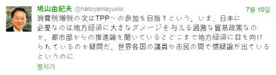 ¼Òºñ¼¼Áõ¼¼ ´ÙÀ½Àº TPP Âü°¡¸¦ ¸ñÇ¥·Î ÇÑ´Ù°í ÇÑ´Ù. Áö±Ý ÀϺ»¿¡°Ô ÇÊ¿äÇÑ °ÍÀº Áö¹æ°æÁ¦¿¡ Å« ÇÇÇØ¸¦ ÁÖ´Â °ú°ÝÇÑ ¹«¿ªÁ¤Ã¥Àΰ¡. µµ½ÃÁö¿ªÀÇ ÃßÁø·ÐÀ» µè°í ÀÖÀ¸¸é ¾îµð±îÁö Áö¹æ°æÁ¦¿¡ °ü½ÉÀÌ ÀÖ´Â °ÍÀÎÁö Àǹ®ÀÌ µç´Ù. ¼¼°è°¢±¹ÀÇ ÀÇ¿øÀ̳ª ½Ã¹Î »çÀÌ¿¡¼ ȸÀÇ·ÐÀÌ ³ª¿À°í Àִٴµ¥