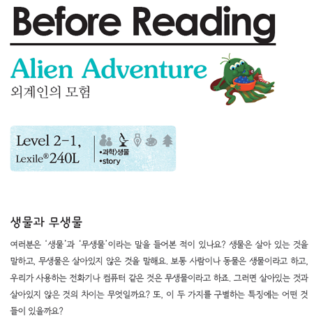 | ¶È¶ÈÇÑ ¿µ¾î Àбâ Wise & Wide 2-1 ¿Ü°èÀÎÀÇ ¸ðÇè(Alien Adventure) Sarah J. Dodd ¿ìÁÖÀÇ ÃÊ·Ï»ö Ç༺ Á¶°Ç(Zorgan)¿¡ »ç´Â ±Í¿©¿î ÃÊ·Ï ¿Ü°èÀÎ »ïÃÑ»ç, Áö±×, Àç±×, Á¶±×! ¾î´À ³¯, ¹ß »ö±òÀÌ ÆÄ¶þ°Ô º¯ÇÑ Áö±×¸¦ º´¿ø¿¡ µ¥·Á°¡±â À§ÇØ ¿Ü°èÀΠ챏µéÀº Àç±×ÀÇ »õ ½ºÆäÀ̽º ½ºÇÇ´õ¿¡ ¿Ã¶óŸ¿ä. ¾î! ±×·±µ¥ ½ºÆäÀ̽º ½ºÇÇ´õ°¡ °©Àڱ⠿ìÁÖ·Î ³¯¾Æ°¡´õ´Ï ³¸¼± Ç༺À¸·Î Ãß¶ôÇϳ׿ä. °ú¿¬, Áö±×, Àç±×, Á¶±×´Â ¹«»çÇÒ ¼ö ÀÖÀ»±î¿ä? |