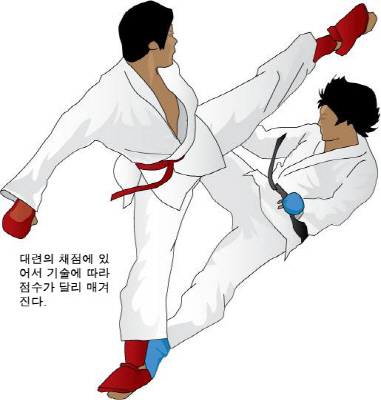 Áß´ÜÄ¡±â ¹× »ó´ÜÄ¡±â´Â 1Á¡, Áß´ÜÂ÷±â´Â 2Á¡, »ó´ÜÂ÷±â´Â 3Á¡À» Áִµ¥, »ó´ëÀÇ Áß½ÉÀ» ¹«³Ê¶ß¸° ´ÙÀ½ Áß´ÜÄ¡±â¸¦ ¼º°øÇϸé 2Á¡, »ó´ëÀÇ µî¿¡ Áß´ÜÄ¡±â¸¦ ¼º°øÇßÀ» ¶§´Â 2~3Á¡, »ó´ë¸¦ ³Ñ¾î¶ß¸®°í ÁÖ¸Ô È¤Àº ¹ß·Î »ó´ë¸¦ °¡°ÝÇßÀ» ¶§ 3Á¡À» ÁÝ´Ï´Ù. Ãæ°í¿Í °æ°í´Â µû·Î ±¸ºÐÀ» ÇÏ¸ç µÑ Áß Çϳª¸¦ 2¹ø ¹ÞÀ¸¸é »ó´ëÆí¿¡°Ô 1Á¡À» ÁÖ°í, 3¹ø ¹ÞÀ¸¸é »ó´ë¹æÀº 2Á¡, Çѹø ´õÇϸé ÅðÀåÀÌ ¼±¾ðµÇ°í, ÄÚÆ® ¹ÛÀ¸·Î ³ª°¡´Â ¼±¼ö¿¡°Ô´Â Ãæ°í¸¦ ÁÙ ¼ö ÀÖ½À´Ï´Ù. »ó´ëÀÇ ¾ó±¼ÀÌ µ¹¾Æ°¥ Á¤µµ ȤÀº ¸öÅëÀ» ³Ê¹« ¼¼°Ô ¸ÂÃß´Â µî ³Ê¹« ¼¼°Ô °¡°ÝÇßÀ» ¶§¿¡´Â °æ°í¸¦ Áִµ¥, À̰Ϳ¡ ´ëºñÇÏ¿© »ó´ë°¡ °¡°ÝÇϱ⠽¬¿î ºÎÀ§¸¦ Çë°ÒÀ¸·Î °¨½Ñ ´Ü´ÜÇÑ ¹°Ã¼³ª ³ª¹«¸¦ ¶§¸®´Â ÈÆ·ÃÀ» °ÅµìÇÏ¿© ´Ü´ÜÇÏ°Ô ¸¸µì´Ï´Ù. ÈÆ·Ã ¹ÞÀº »ç¶÷Àº µÎ²¨¿î ¼ÛÆÇµµ ¸Ç¼ÕÀ̳ª ¸Ç¹ß·Î ºÎ¼ú ¼ö ÀÖ´Ù°í Çϳ׿ä. ¶Ç ½Ã°£ Á¶Àý¸¸Å Áß¿ä½Ã µÇ´Â °ÍÀº ±â¼ú ¹× Á¤½Å·ÂÀ̶ó°í Çϳ׿ä.