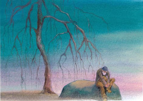Estragon, sitting on a low mound, is trying to take off his boot. He pulls at it with both hands, panting. He gives up, exhausted, rests, tries again.