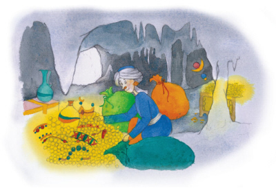 ¡°Wow! There are rich silks, carpets, gold, silver, and bags of money,¡± cried Ali Baba. He loaded his three mules with as many bags as possible. When he was finished, Ali Baba said, ¡°Close, sesame,¡± and the door closed. He then went straight home.
