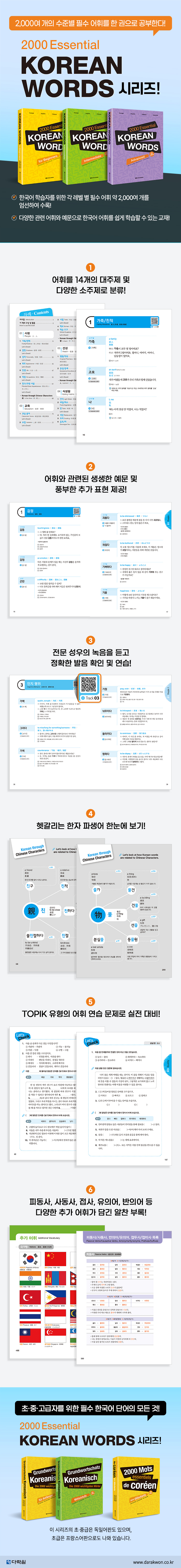 이 책은 ‘2000 Essential Korean Words - Intermediate’의 독일어판으로, 독일어권 학습자들이 보다 쉽고 원활하게 한국어 어휘를 학습할 수 있도록 기존 교재를 보완한 한국어 중급 어휘집이다. 한국 내 8개 대학 부속 한국어 교육 기관에서 사용하는 교재들에 출현한 중급 레벨의 단어와 한국어능력시험(TOPIK) 모든 영역 기출 단어 중 필수 단어 2000개를 선별하여 14개의 주제별 분류, 표제어와 실생활에 유용한 예문을 수록했다. 표제어와 예문에 독일어권 학습자들을 위한 독일어 번역을 표기하여 정확한 한국어 어휘의 의미를 전달하고자 하였고, 동의어, 반의어 높임말, 낮춤말, 관련어, 참고어 등 다양한 관련 어휘를 추가하여 어휘력 신장에 도움을 주고자 했다. 또한, 표제어와 예문을 표준 발음으로 읽은 MP3 파일을 QR 코드로 제공하여 학습자들이 단어의 정확한 발음을 듣고 말할 수 있도록 했다.