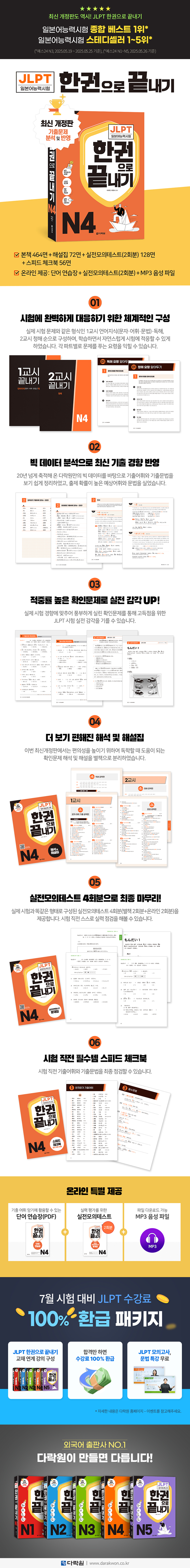 『최신 개정판 JLPT(일본어능력시험) 한권으로 끝내기 N4』는 1998년 처음 발간되어 20년 넘게 일본어 학습자들의 큰 사랑을 받고 있는 『일본어능력시험 한권으로 끝내기 시리즈』의 다섯 번째 개정판입니다.