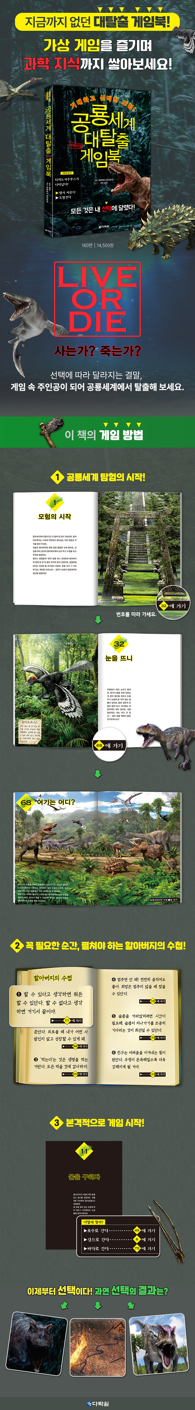 신비로운 공룡세계에서 탈출하기 위한 여정을 담은 새로운 감각의 게임북입니다. 독자는 주인공이 되어 살아남기 위한 행동을 ‘선택’하게 되죠. 각 선택에 따라 기상천외한 이야기가 펼쳐지고 각각의 결말을 맞이하게 됩니다. 여러 번 도전해서 마침내 공룡세계를 탈출했을 때는 가상 체험을 통해 다양한 지식이 쌓여 있을 것입니다.