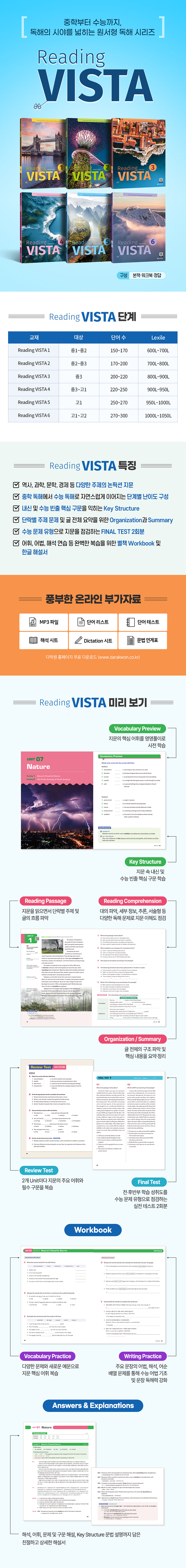 『Reading VISTA』 시리즈는 중학 독해에서 고등 및 수능 독해로 자연스럽게 이어지도록 설계된 6단계 원서형 독해 시리즈이다. 다양한 논픽션 지문을 통해 배경지식을 넓히고, 단계별로 심화되는 주제와 문장 구조를 접하며 학문적 독해 능력을 기를 수 있다. 특히 지문마다 수능 필수 구문이 포함되어 있어 수능 수준의 문장 구조와 어법을 자연스럽게 익힐 수 있도록 구성했다. 또한 별책으로 제공되는 워크북을 통해 문장 구조, 어휘 활용, 해석까지 균형 있는 학습이 가능하며, 권말의 FINAL TEST는 학습한 내용을 수능 문제 유형으로 점검함으로써 수능 독해의 기초 체력을 다질 수 있도록 돕는다.
