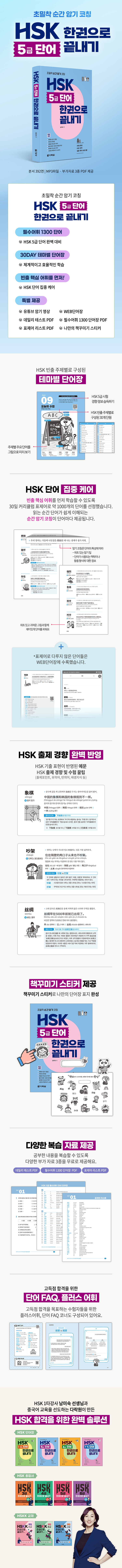 『HSK 5급 단어 한권으로 끝내기』는 단순 암기법의 한계를 쉽고 재미있게 극복하실 수 있도록 HSK 5급 어휘를 HSK에 자주 출제되고 실생활에도 자주 사용되는 주제별 테마 단어장으로 풀어냈습니다. 특히 HSK 최신 기출문제를 바탕으로 출제 빈도가 높은 표현을 반영해 모든 예문을 구성함으로써 단어 공부를 하면서 동시에 자연스럽게 HSK 실력도 향상될 수 있도록 구성하였습니다.