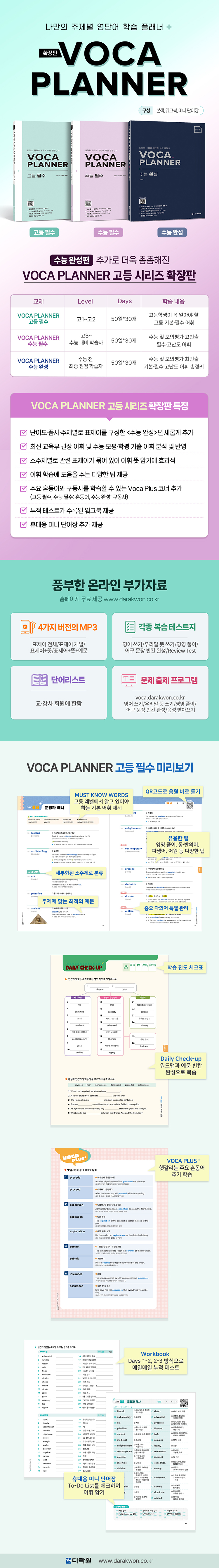 『VOCA PLANNER 고등 시리즈 확장판』은 <수능 완성> 단계를 새롭게 추가하여 <고등 필수>, <수능 필수>, <수능 완성> 총 3단계로 확장 구성했다. 최신 교육과정 권장 어휘와 주요 고등 교과서, 수능 기출, 모의평가, 학력평가를 분석하여 고등학생이 꼭 알아야 할 필수 어휘를 더욱 촘촘하게 학습할 수 있도록 했다. 또한 확장판에 새롭게 추가된 Voca Plus 코너를 통해 주요 혼동어를 학습할 수 있다. 주제에 맞는 유용한 예문과 다양한 팁 등을 통해 중요 고등 어휘를 체계적으로 학습할 수 있을 것이다.