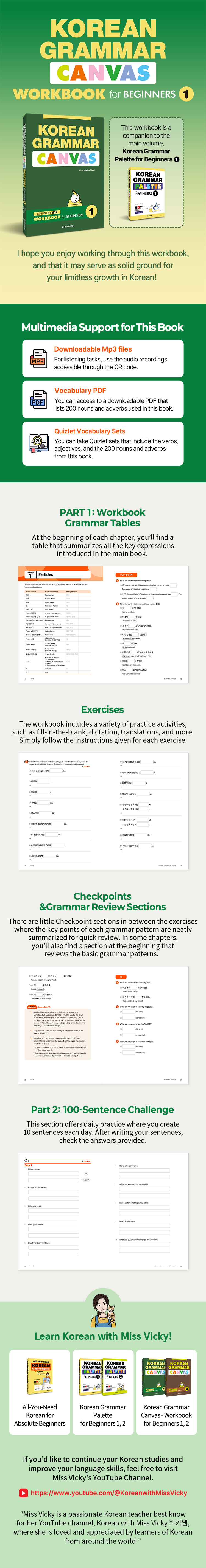 This book consists of two parts: Part 1, the Workbook, and Part 2, the Final Sentence-Building Practice. At the beginning of each chapter, you’ll find a table that summarizes all the key expressions introduced in the main book. And it includes a variety of practice activities, such as fill-in-the-blank, dictation, translations, and more. Part 2 offers daily practice where you create 10 sentences each day. After writing your sentences, check the answers provided. Also, you can download a PDF file containing 200 Korean nouns and adverbs and Quizlet where you can study the verbs, adjectives, nouns, and adverbs included in this book.