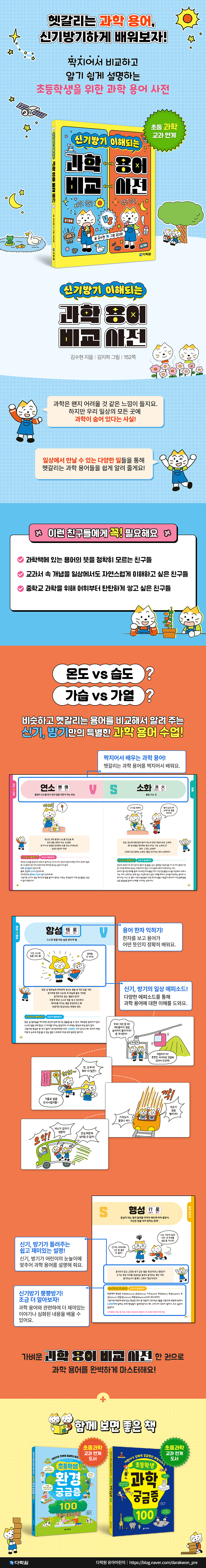 과학이 어려워지는 순간은 용어가 낯설게 느껴질 때인 것 같아요. 이 책은 바로 그런 고민에서 출발했어요. 특히 한자어가 많고 비슷한 용어들이 많아 어렵게 느껴지는 과학 용어들을 쉽게 알려 주고자 했어요. 비슷해서 헷갈리는 용어들을 짝지어 신기와 방기 캐릭터를 통해 쉽게 설명하면서, 아이들이 과학 용어를 제 것처럼 습득할 수 있도록 돕고자 했어요. 그리고 용어의 한자와 한자의 뜻, 더 심화된 내용과 흥미로운 이야기까지 수록하여 폭 넓게 과학이라는 과목을 이해할 수 있도록 구성했어요. 이렇게 『과학 용어 비교 사전』으로 배운 과학 용어들은 중학교에 가서도 과학 공부를 수월하게 할 수 있도록 돕는 든든한 지원군이 되어 줄 거예요.