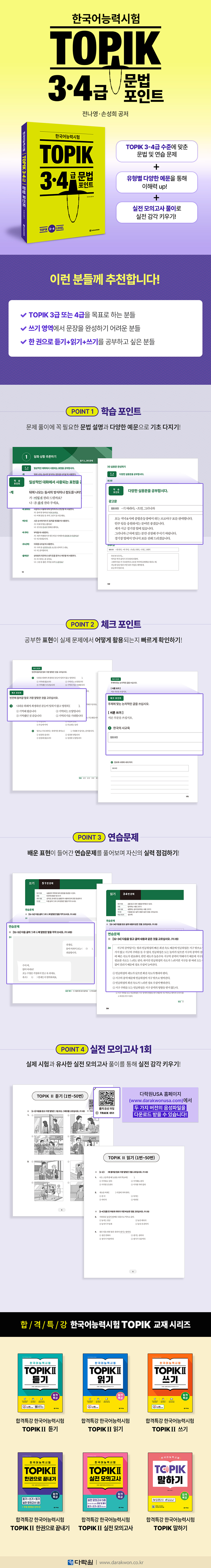 한국 유학이나 취업을 꿈꾸는 학습자들에게 한국어능력시험(TOPIK) 응시는 필수적이다. 이 책은 학습자들이 TOPIK Ⅱ의 듣기, 쓰기, 읽기 전 영역의 문법을 완벽하게 대비할 수 있도록 구성되었다. 모든 지문과 문항은 3~4급 수준의 학습자에게 반드시 필요한 어휘와 문법을 분석하여 구성하였다. 또한, 모든 영역의 실제 시험 문제를 자세히 분석한 문제로 실전 대비가 가능하다. 듣기 음성 파일은 기본 음성과 시험장에서 들리는 음성 두 가지 버전으로 QR코드를 통해 다락원USA 홈페이지(www.darakwonusa.com)에서 들을 수 있다.