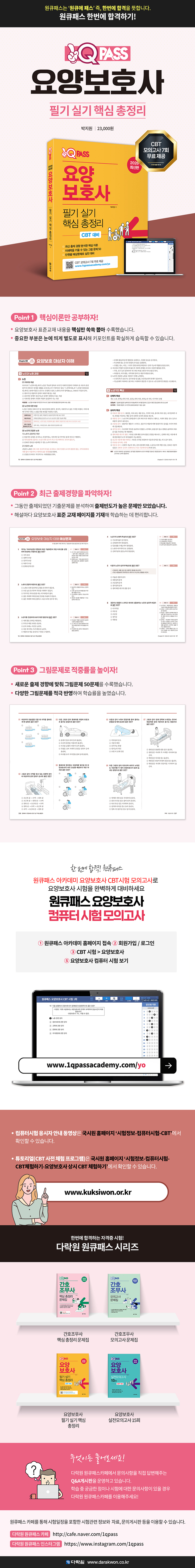 이와 같은 요양보호사가 되기 위해서는 소정의 교육기관에서 교육과정을 이수하고 요양보호사 필기, 실기 시험에 응시하면 됩니다. 요양보호사 자격시험은 다양한 문제를 접하고 풀어보는 것이 관건입니다. 그렇기에 이 책은 최신 경향의 다양한 유형의 문제를 접하고, 공부하는 수험생 여러분 자신의 취약한 단원과 관련된 문제를 파악할 수 있는 기회이기도 합니다.
