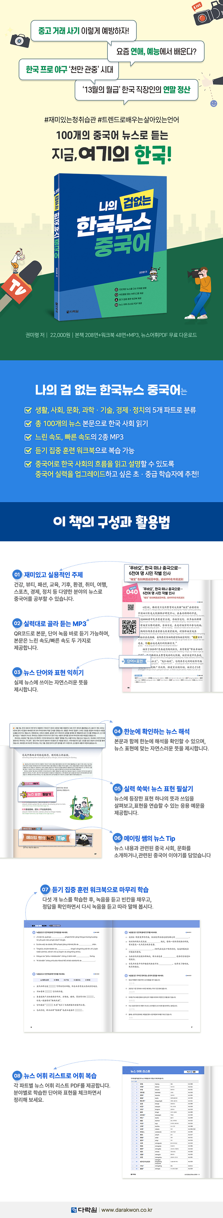 『나의 겁 없는 한국뉴스 중국어』는 한국의 흥미로운 테마의 최신 시사 뉴스 100개를 엄선하여 중국어로 학습할 수 있도록 설계된 교재입니다. 단순한 언어 학습을 넘어, 우리가 살아가는 한국 사회의 이슈를 중국어로 표현하는 능력을 길러줍니다.