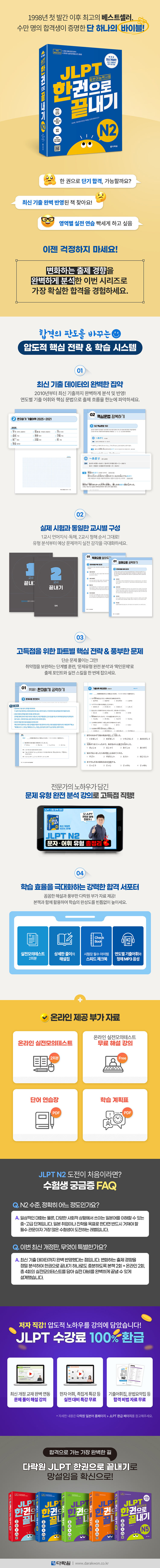 『(최신 개정판) JLPT(일본어능력시험) 한권으로 끝내기 N2』는 1998년 첫 발간 이후 큰 사랑을 받아온 시리즈의 여섯 번째 개정판으로, N2 시험의 전 영역을 한 권으로 마스터할 수 있는 종합 대비서입니다. 2010년부터 2025년까지의 최신 기출 데이터를 철저히 분석하여 반영하였으며, 실제 시험과 동일하게 1교시 언어지식(문자·어휘·문법)·독해, 2교시 청해 순으로 구성하여 실전 감각을 극대화합니다. 단순한 문제 풀이를 넘어 각 파트별 총정리, 확인문제, 예상 문제는 물론 실전모의테스트 4회분(본책 2회분+온라인 2회분)과 해설집, 스피드 체크북, 단어 연습장(PDF), 학습 계획표(PDF)까지 제공하여 고득점 합격을 돕습니다. 청해와 연도별 기출어휘 듣기 음성은 다락원 홈페이지나 QR코드를 통해 스마트폰으로 바로 듣거나 다운로드 하실 수 있습니다.