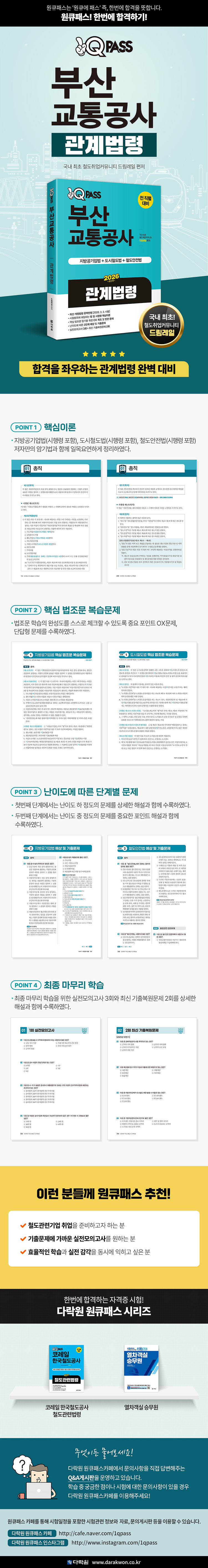 부산교통공사는 2025년 상반기 공채시험부터 공공의 안전의식을 확립하기 위해 관계법령 문항을 추가하였다. 지원분야에 상관없이 일반직 필기시험 응시자 모두가 응시해야 하는 필수과목이며 과락이 있기 때문에 합격 당락에 중요한 과목이다. 이에 합격에 필요한 모든 것을 담은 <2026 원큐패스 부산교통공사 관계법령> 특징은 다음과 같다.
