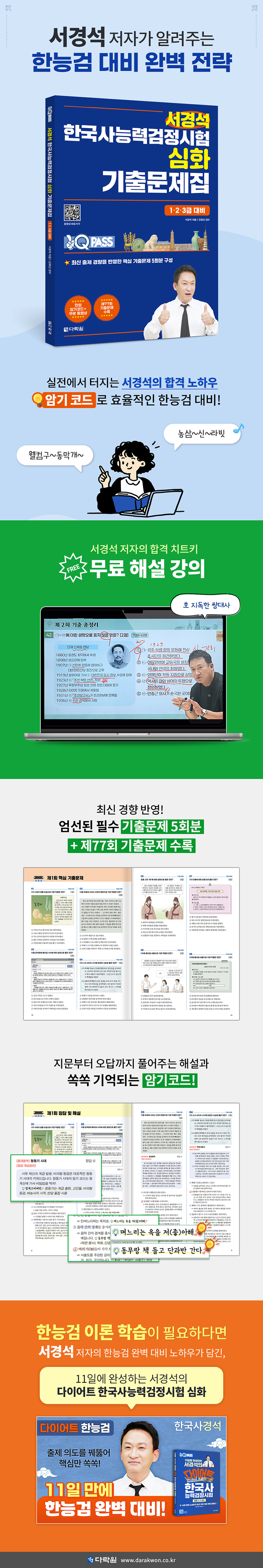 여기에 한국사능력검정시험 1급·만점 취득자이자 방송인 출신 저자 서경석이 직접 진행하는 무료 해설 동영상 강의까지 제공되어, 독학 수험생도 흔들리지 않고 학습을 완주할 수 있습니다. 한능검 심화를 처음 준비하는 입문자부터 단기 고득점 합격을 노리는 직장인·취업준비생까지, 이 한 권으로 한국사능력검정시험 심화를 완벽하게 대비하세요.