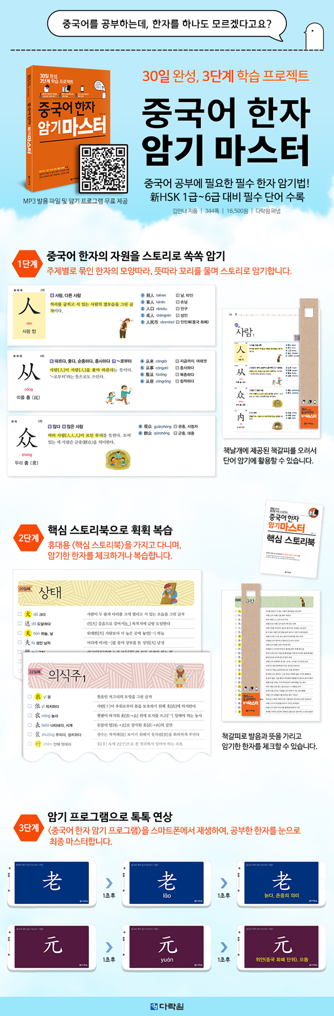 『중국어 한자 암기 마스터』는 중국어 학습에 필요한 필수 한자의 자원을 스토리로 풀어낸 책이다. 자원의 스토리를 읽기만 하면 중국어 한자의 뜻이 저절로 연상된다. 스토리에는 학습자가 한자를 암기할 때 품을 수 있는 궁금증에 대비한 답이 숨어 있다. 특히, 특별 제공되는 책갈피, 핵심 스토리북, 한자 암기 프로그램을 모두 활용하면 더욱 완벽하게 중국어 한자를 마스터할 수 있다.
