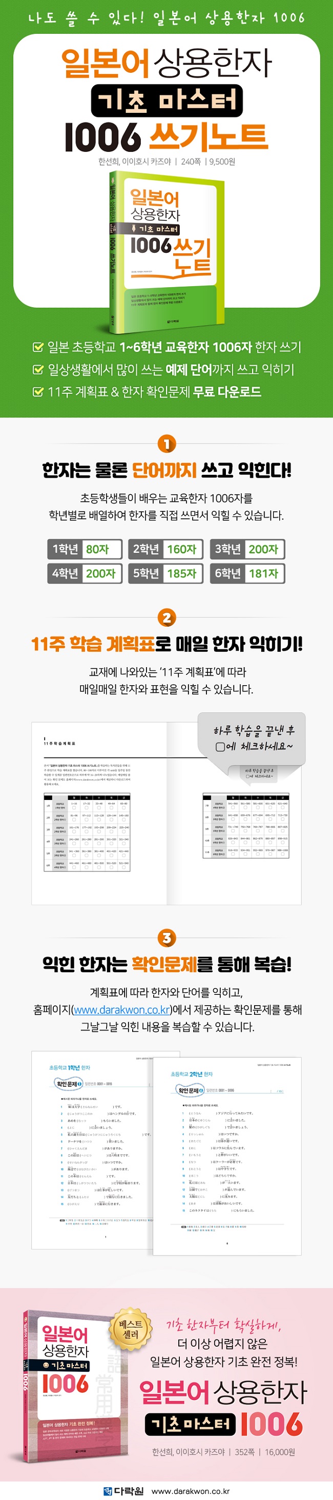 일본어 학습의 증가로 학생들의 일본어 회화 구사 능력은 좋아졌으나 일본어 쓰기 실력은 향상되지 않아 학생들의 실력이 초기 단계에 머무는 경우가 많습니다. 그 원인은 바로 부족한 한자 학습 시간에 있습니다. 한자를 읽지 못하고 쓰는 데 서툴러 일본어 어휘 수준이 낮기 때문입니다. 그 결과 일본어 실력은 늘지 않고 간단한 회화를 하는 수준에 그치고 맙니다. 이 책은 일본의 초등학교에서 배우는 한자를 학년별로 나누어 음과 훈, 의미를 적고 기초에서 필요한 음독과 훈독 단어를 제시하고 있습니다. 한자 자체를 쓰는 연습과 함께 자주 쓰이는 단어나 표현에도 공란을 두어, 다시 한번 단어를 익히며 써볼 수 있도록 하였습니다. 또한 11주 학습계획표와 함께 그날 익힌 한자를 복습하는 확인문제도 제공하고 있습니다.
