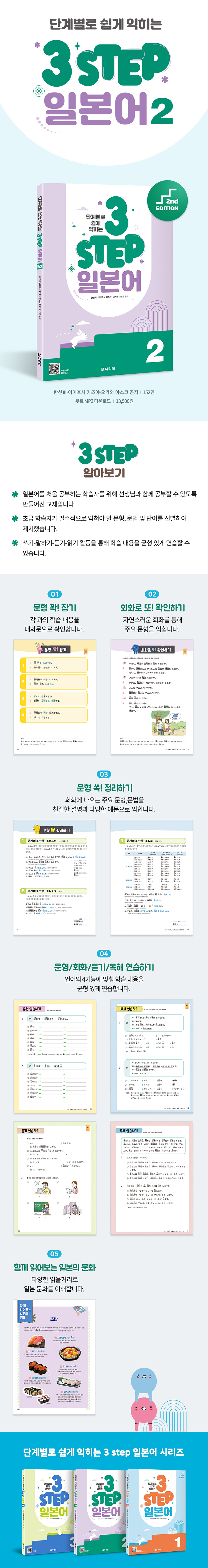 『(2nd EDITION) 단계별로 쉽게 익히는 3 Step 일본어』는 『단계별로 쉽게 익히는 3 Step 日本語』의 개정판으로, 초급 학습자에게 꼭 필요한 문법과 문형을 쉽고 간단하게 배울 수 있도록 3단계로 구성된 교재입니다. 『(2nd EDITION) 단계별로 쉽게 익히는 3 Step 일본어 2』는 그 중 2단계 교재입니다. 이 책은 전체 10과로 구성되어 있으며, 초급자가 필수적으로 익혀야 할 문형 및 문법, 단어를 선별하여 제시했습니다. 각 과는 문형 미리보기, 문형 꽉 잡기, 회화로 또 확인하기, 문형 쏙 정리하기, 문형/회화/듣기/독해 연습하기로 구성하여, 반복 학습을 통해 쓰기/말하기/듣기/읽기 활동을 할 수 있습니다. 부록으로 무료 MP3 파일을 제공합니다. 다락원 홈페이지 또는 QR코드를 통해 스마트폰으로 바로 듣거나 다운로드 할 수 있습니다.