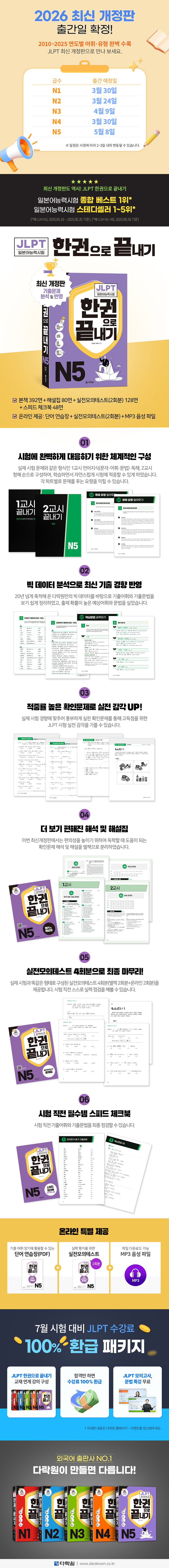 『최신 개정판 JLPT(일본어능력시험) 한권으로 끝내기 N5』는 1998년 처음 발간되어 20년 넘게 일본어 학습자들의 큰 사랑을 받고 있는 『일본어능력시험 한권으로 끝내기 시리즈』의 개정판으로, 2016년 개정된 JLPT(일본어능력시험) N5의 최신 개정판입니다.