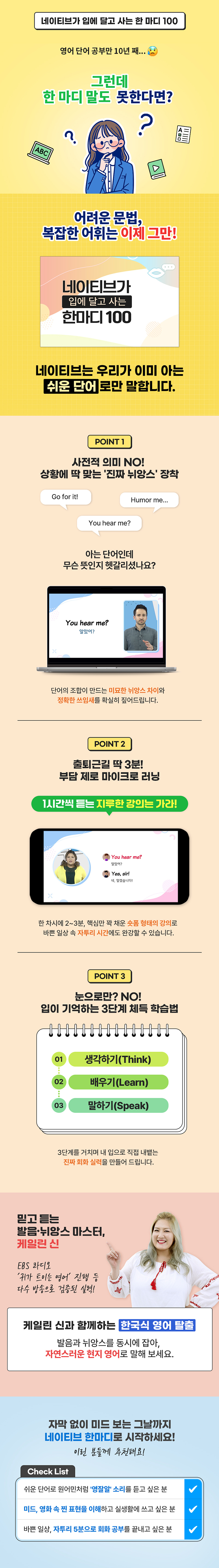 단순히 듣기만 하는 강의가 아닌, 생각하기(Think)→배우기(Learn)→말하기(Speak) 3단계를 통해 직접 말로 내뱉는 ‘체득형 학습’을 완성할 수 있습니다.