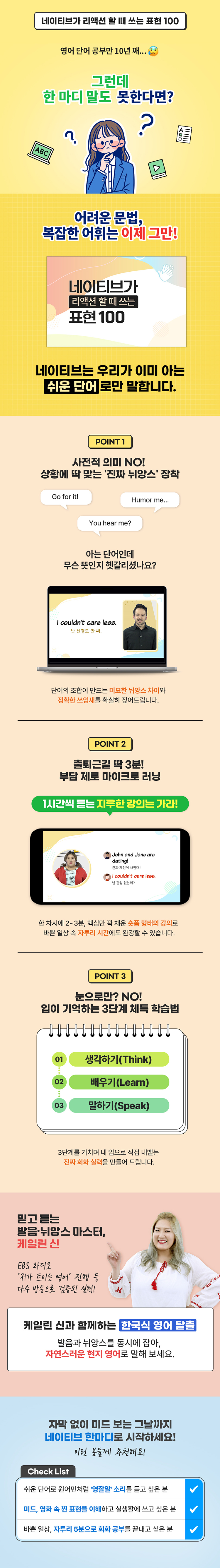 우리가 영어를 어렵게 느끼는 이유는 ‘어렵고 복잡해야 제대로 된 영어’라는 선입견 때문입니다. 하지만 실제 네이티브가 가장 자주 쓰는 표현은 오히려 쉽고 간단합니다. 너무 단순해서 한국인 입장에서는 뜻을 바로 알아차리기 어려울 정도죠. 네이티브가 리액션 할 때 쓰는 표현 100은 상대의 말을 듣다가 자연스럽게 툭 던지듯 반응할 때 사용하는 짧고 간단한 표현을 익히는 강좌입니다.