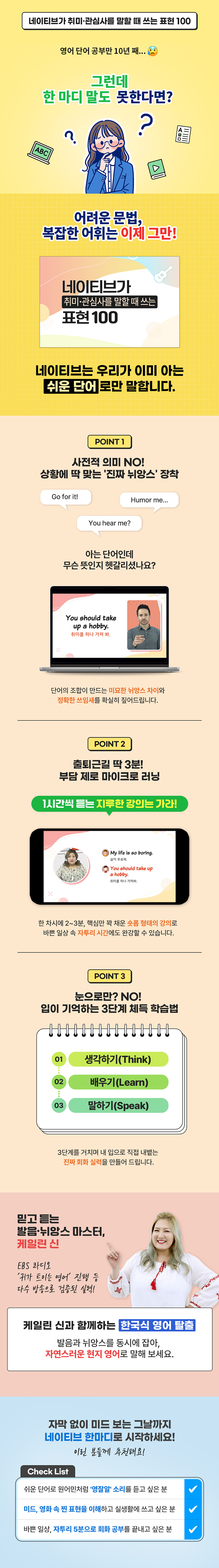 단순히 듣기만 하는 강의가 아닌, 생각하기(Think)→배우기(Learn)→말하기(Speak) 3단계를 통해 직접 말로 내뱉는 ‘체득형 학습’을 완성할 수 있습니다.