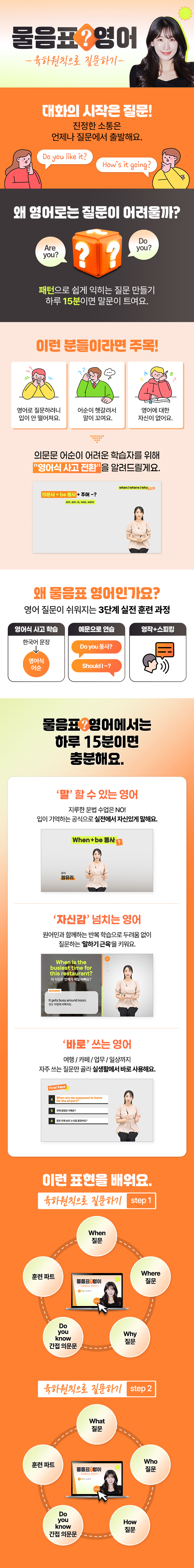 사무실이 어디예요?처럼 쉽고 간단한 질문부터 제 영어 실력을 어떻게 향상할 수 있을까요?처럼 길고 조심스럽게 물어보는 질문까지, 일상에서 자주 쓰는 문장을 선별하여 실생활 적용력을 높였습니다. <물음표 영어> 강의 하나로 실전 커뮤니케이션 능력까지 한 번에 챙겨가세요.